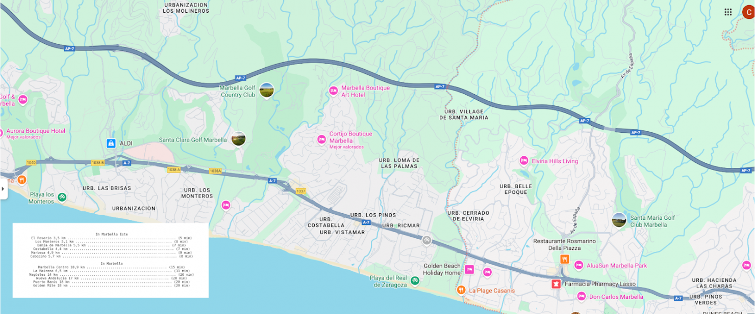 Wenn Sie sich entscheiden, eine unserer Immobilien zu mieten und mit Ihrem Fahrzeug andere Teilbereiche von Marbella Este zu erkunden, wie Bahía de Marbella oder Costabella (weitere Informationen zu den Entfernungen finden Sie unter: Entdeckung von Elviria), oder sogar weiter zu fahren und andere Gegenden von Marbella zu besuchen, wie Puerto Banús oder Nueva Andalucía, oder andere wundervolle Gemeinden an der Costa del Sol, wie Ojén (15,9 km, zwischen 20 und 26 Minuten mit dem Auto über die A-7), Istán (27,4 km, zwischen 35 und 45 Minuten mit dem Auto über die Carr. Istán/A-7176), La Cala de Mijas (27,5 km, zwischen 20 und 28 Minuten mit dem Auto über die A-7 und AP-7), Benahavis (29,6 km, zwischen 26 und 35 Minuten mit dem Auto über die Autovía del Mediterraneo/A7) oder Estepona (40,5 km, zwischen 28 und 40 Minuten mit dem Auto über die AP-7), werden Sie sicher die Nähe zur Tankstelle Madese - Repsol. Hinweis: Diese Tankstelle bietet Dieselkraftstoff an.