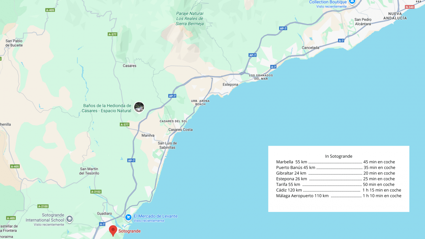 Sotogrande liegt entlang der Autobahnen A-7 und AP-7, den Hauptachsen, die die Costa del Sol mit dem Campo de Gibraltar verbinden. Dieses Straßennetz garantiert eine bequeme Anbindung sowohl an den Flughafen Gibraltar (15 Autominuten) als auch an wichtige Ziele wie Marbella, Estepona oder Cádiz. Auch die N-340 ist eine Option, allerdings bieten die A-7 und AP-7 eine direktere und angenehmere Verbindung.