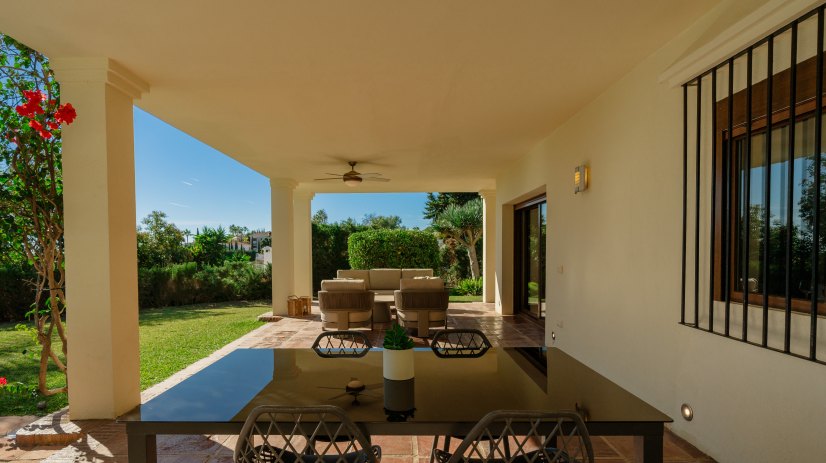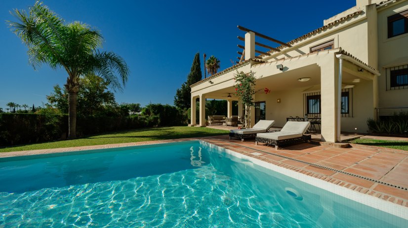 Mediterrane Villa mit großem Außenbereich: Pool, Garten, Veranda, Terrasse mit Aussicht und Garage, in Valle del Golf, Marbella