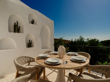 From the living room, there is also access to an excellent terrace that floods the interior with natural light. It features a beautiful oak wood table and offers breathtaking views of the sea and the lush greenery of Artola — because at Casa Cueva, every detail counts.