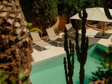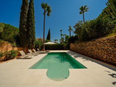 The two main bedrooms are on the upper floor. The first includes a double bed, Smart TV, desk, air conditioning, built-in wardrobes, an en-suite bathroom with shower, and access to a private balcony with views of the pool. The second bedroom also features a double bed, an en-suite bathroom with bathtub and shower, wardrobe, and air conditioning. In addition, this floor provides access to a large terrace with views of the garden and pool – the perfect spot to relax outdoors at any time of day.