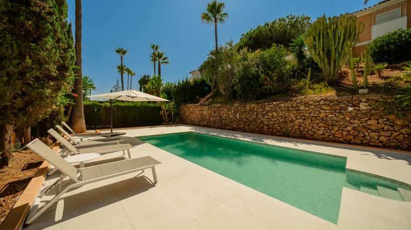 Die Villa Piña erstreckt sich über zwei Etagen, die durch eine Treppe verbunden sind. Bei Ihrer Ankunft erwartet Sie ein Außenbereich mit einem großen privaten Pool, umgeben von Sonnenliegen, auf denen Sie das privilegierte Klima der Costa del Sol genießen können. Auf dieser Ebene mit dem Pool befindet sich auch eine wunderschöne Terrasse, die den Außenbereich vervollständigt – aufgeteilt in zwei Zonen: eine überdachte Veranda mit Essbereich für sechs Personen und ein etwa 30 m² großer offener Bereich mit Garten und Pflanzen, einer gemütlichen Chill-out-Zone und einem Grillplatz – ideal, um den Sonnenuntergang zu erleben, im Freien zu essen und die warmen Abende im Süden zu genießen.
