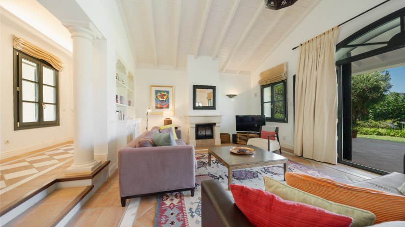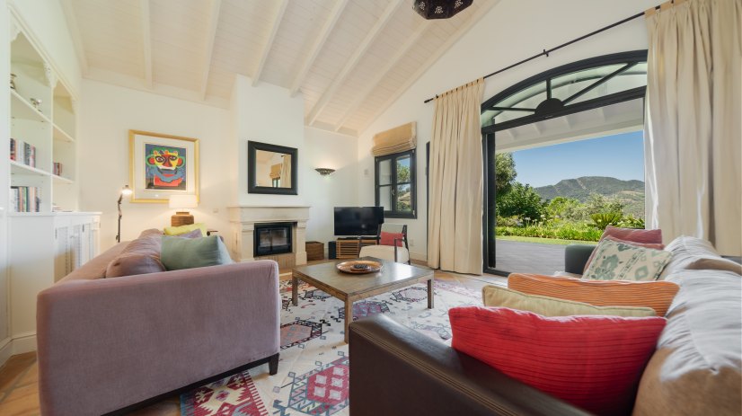 Die Villa erstreckt sich über eine einzige Etage und bietet ein vollkommenes Entspannungserlebnis in einer stilvollen und einladenden Umgebung. Vom Eingangsbereich gelangt man in ein geräumiges und helles Wohnzimmer mit hohen Decken, Kamin, Fernseher, geschmackvoller Dekoration und großen Bücherregalen, gefüllt mit Büchern aller Art. Von hier aus gelangt man direkt auf eine teilüberdachte Terrasse mit einem Essbereich im Freien, der einen Grill und Chill-out-Sofas umfasst – ideal für Mittag- oder Abendessen mit Blick auf die Natur.